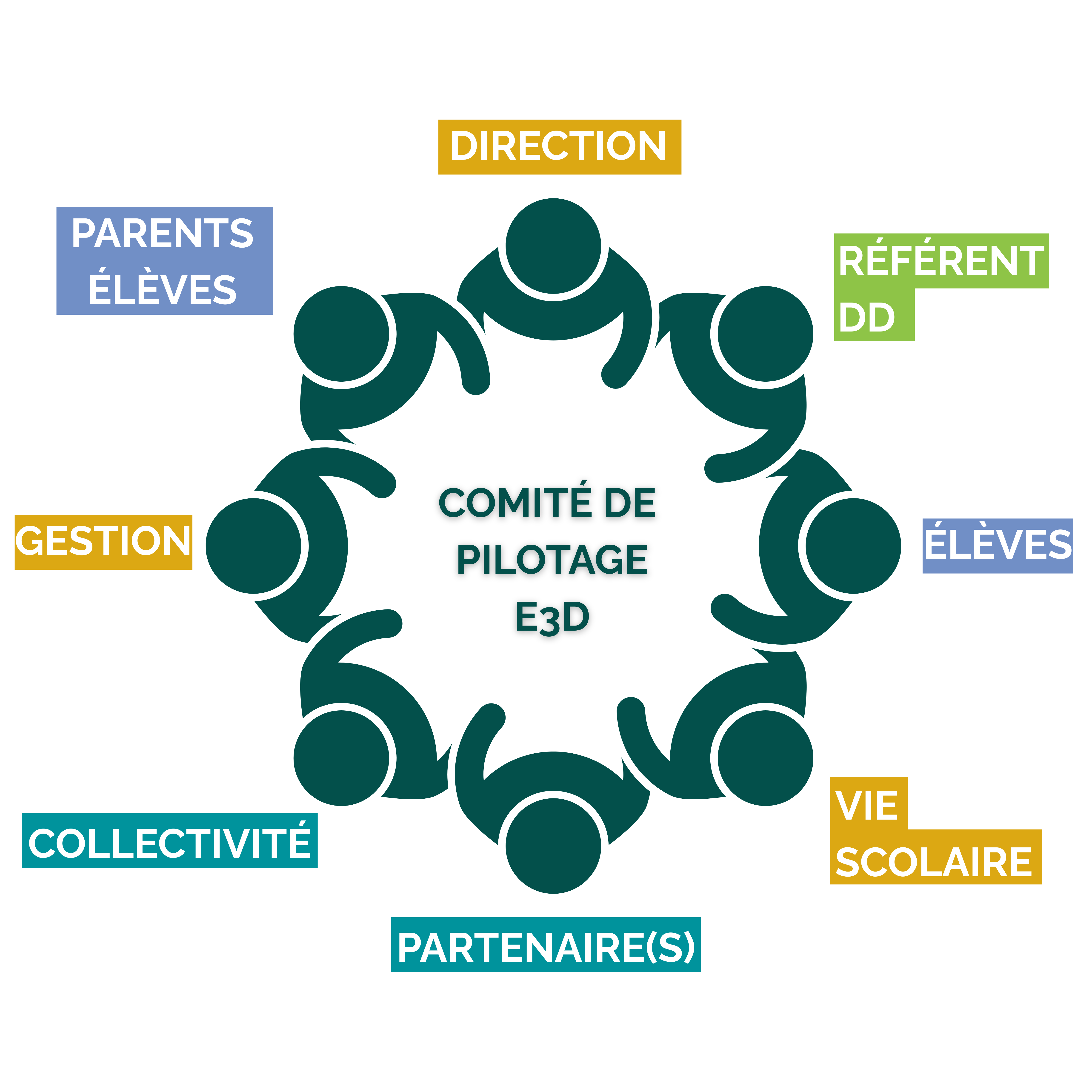 L’instance de pilotage, qui peut être nommée Comité de pilotage E3D, est composée des acteurs impliqués dans les actions que l’établissement souhaite mettre en place. Il s’agit d’abord des personnes qui agissent sur le fonctionnement de l’établissement : la Direction, la Gestion, La Vie scolaire. Il s’agit aussi des acteurs associés au volet pédagogique : des représentants des enseignants et des élèves. Il s’agit enfin des partenaires extérieurs : les collectivités locales, des partenaires associatifs... Sans oublier les représentants des parents d’élèves, car la démarche doit aussi rayonner à l’échelle des familles.
