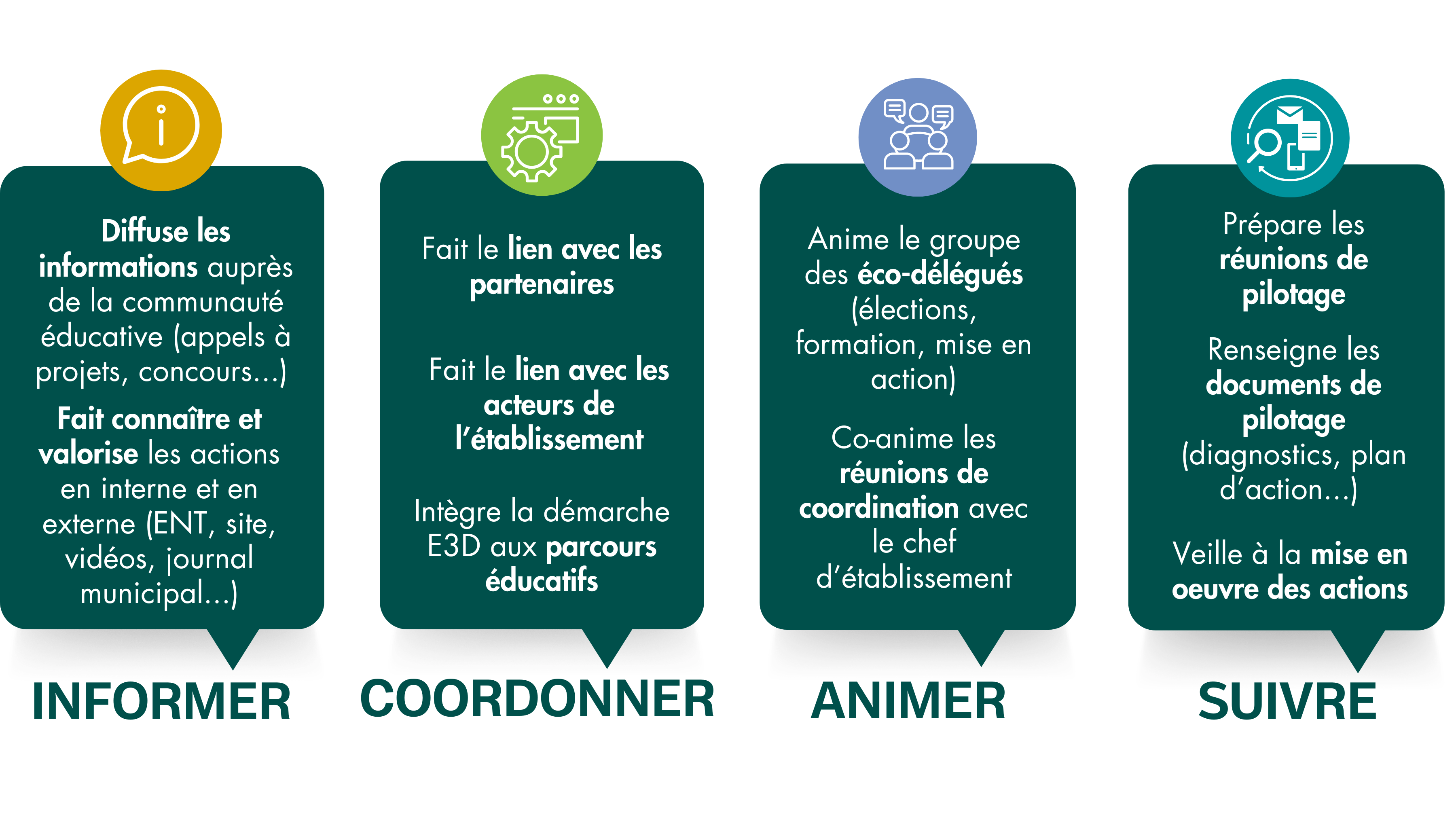 Il peut aussi former les éco-délégués, animer un Club Développement durable, organiser des formations auprès du personnel. La fonction prend nécessairement du temps et beaucoup d’engagement, elle nécessite une rémunération (IMP, HSE...).